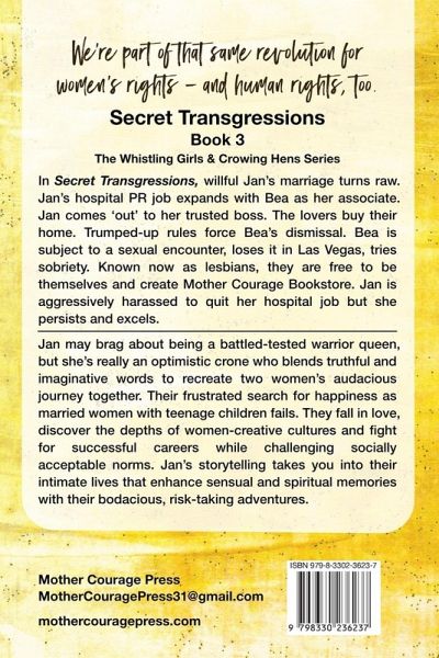In Secret Transgressions, willful Jan's marriage turns raw. Jan's hospital PR job expands with Bea as her associate. Jan comes 'out' to her trusted boss. The lovers buy their home. Trumped-up rules force Bea's dismissal. Bea submits to a sexual encounter, loses it in Las Vegas, tries sobriety. Known now as lesbians, they are free to be themselves and create Mother Courage Bookstore. Jan is aggressively harassed to quit her hospital job but she persists and excels. Jan may brag about being a battled-tested warrior queen, but she's really an optimistic crone who blends truthful and imaginative words to recreate two women's audacious journey together. Their frustrated search for happiness as married women with teenage children fails. They fall in love, discover the depths of women-creative cultures and fight for successful careers while challenging socially acceptable norms. Jan's storytelling takes you into their intimate lives that enhance sensual and spiritual memories with their bodacious, risk-taking adventures.