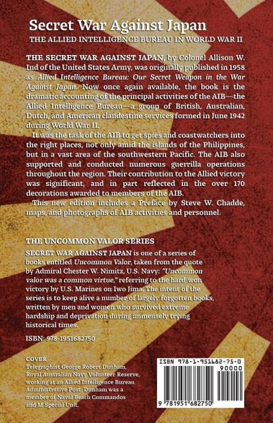 The Secret War Against Japan, by Colonel Allison W. Ind of the United States Army, is the dramatic accounting of the principal activities of the AIB - the Allied Intelligence Bureau - a group of British, Australian, Dutch, and American clandestine services formed in June 1942 during World War II. The AIB performed roughly the same functions as the Office of Strategic Services (OSS, predecessor of the Central Intelligence Agency). The AIB was under the command of Australian Colonel C.G. Roberts who reported directly to Major-General Charles A. Willoughby, General Douglas MacArthur's Chief Intelligence Officer for the South West Pacific area (SWPA). Author Ind served as Deputy Controller for the organization. Post-war, the AIB was disbanded and Ind served as a senior staff member on MacArthur's post-war occupation force in Japan. This edition features a new Preface by Steve Chadde and is illustrated with maps and photographs.