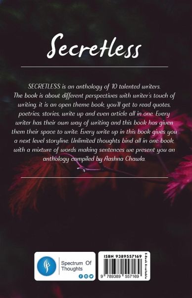SECRETLESS is an anthology of 10 talented writers The book is about different perspectives with writers touch of writing it is an open theme book youll get to read quotes poetries. stories, write up and even article all in one Every writer has their own way of writing and this book has given them their space to write. Every write up in this book gives you a next level storyline. Unlimited thoughts bind all in one book with a mixture of words making sentences we present you an anthology campiled by Aashna Chawla
