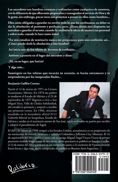 Los sacerdotes son hombres comunes y ordinarios como cualquiera de nosotros, con la diferencia de que ellos están preparados y consagrados al servicio de Dios y de la gente, sin embargo, pocas veces nos ponemos a pensar en ellos como hombres... Ellos están obligados a guardar en secreto todo lo que les confesamos, su deber es dar la absolución al penitente y perdonar, pero, ¿Hasta dónde está dispuesto un sacerdote a guardar el secreto, cuando la confesión le afecta de manera tan personal y sobre todo, cuando le hace tanto daño? "En mis estudios de seminario nunca me prepararon para una confesión así... ¿Cómo puedo darle la absolución a éste hombre? Así inicia uno de los relatos de Secretos de confesión... Atrévete a ponerte en el lugar del sacerdote y dime: ¿Tú, en su lugar, que harías? Y algo más... Sumérgete en los relatos que tocarán tu corazón, te harán estremecer y te sorprenderán por los inesperados finales...