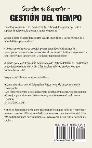 ¡Desbloquea los secretos ocultos de la gestión del tiempo y aprende a superar la adicción, la pereza y la postergación! ¿Usted quiere desarrollarse entre la auto-disciplina y la concentración y tener hábitos productivos? A veces somos nuestros propios peores enemigos. Utilizamos la postergación y las excusas para obstaculizar nuestro éxito y progreso en la vida. Preferimos la televisión y no hacer algo productivo. ¿Buenas noticias? ¡Con estas habilidades de gestión del tiempo, finalmente puede hacerse cargo de su día y desarrollar hábitos productivos que cambiarán su vida! Lo que usted obtiene en este libro:Cómo planificar con anticipación y hacer listas de tareas realistas y manejables Las mejores formas de establecer sus objetivos y alcanzarlos paso a paso Consejos para eliminar distracciones y mantenerse enfocado en su trabajo. ¡Y MUCHO MÁS! Nunca es demasiado tarde para abandonar los malos hábitos y comenzar un nuevo camino. ¡El auto-cuidado comienza con la autoconciencia! ¡Usa este libro para que finalmente se haga cargo de su vida y persiga sus sueños! ¿Listo para empezar? Desplácese hacia arriba, ¡haga clic en "Comprar ahora" y obtenga su copia!