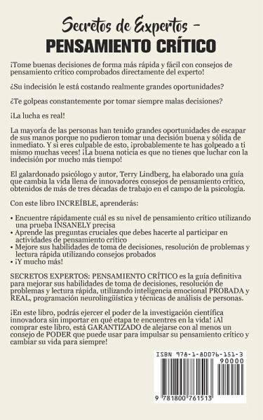 ¡Tome buenas decisiones de forma más rápida y fácil con consejos de pensamiento crítico comprobados directamente del experto! ¿Su indecisión le está costando realmente grandes oportunidades? ¿Te golpeas constantemente por tomar siempre malas decisiones? ¡La lucha es real! La mayoría de las personas han tenido grandes oportunidades de escapar de sus manos porque no pudieron tomar una decisión buena y sólida de inmediato. Y si eres culpable de esto, ¡probablemente te has golpeado a ti mismo muchas veces! ¡La buena noticia es que no tienes que luchar con la indecisión por mucho más tiempo! El galardonado psicólogo y autor, Terry Lindberg, ha elaborado una guía que cambia la vida llena de innovadores consejos de pensamiento crítico, obtenidos de más de tres décadas de trabajo en el campo de la psicología. Con este libro INCREÍBLE, aprenderás: ¿ Encuentre rápidamente cuál es su nivel de pensamiento crítico utilizando una prueba INSANELY precisa ¿ Aprende las preguntas cruciales que debes hacerte al participar en actividades de pensamiento crítico ¿ Mejore sus habilidades de toma de decisiones, resolución de problemas y lectura rápida utilizando consejos probados ¿ ¡Y mucho más! SECRETOS EXPERTOS: PENSAMIENTO CRÍTICO es la guía definitiva para mejorar sus habilidades de toma de decisiones, resolución de problemas y lectura rápida, utilizando inteligencia emocional PROBADA y REAL, programación neurolingüística y técnicas de análisis de personas. ¡En este libro, podrás ejercer el poder de la investigación científica innovadora sin importar en qué etapa te encuentres en la vida! ¡Al comprar este libro, está GARANTIZADO de alejarse con al menos un consejo de PODER que puede usar para impulsar su pensamiento crítico y cambiar su vida para siempre! Desplácese hacia arriba, haga clic en "Comprar ahora" y ¡comience a leer!