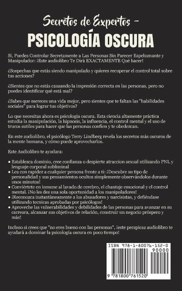 Sí, Puedes Controlar Secretamente a Las Personas Sin Parecer Espeluznante y Manipulador: ¡Este audiolibro Te Dirá EXACTAMENTE Qué hacer! ¿Sospechas que estás siendo manipulado y quieres recuperar el control total sobre tus acciones? ¿Sientes que no estás causando la impresión correcta en las personas, pero no puedes identificar qué está mal? ¿Sabes que mereces una vida mejor, pero sientes que te faltan las "habilidades sociales" para lograr tus objetivos? Lo que necesitas ahora es psicología oscura. Esta ciencia altamente práctica estudia la manipulación, la hipnosis, la influencia, el control mental y el uso de trucos sutiles para hacer que las personas confíen y te obedezcan. En este libro, el psicólogo Terry Lindberg revela los secretos más oscuros de la mente humana, y cómo puede aprovecharlos. Este libro te ayudara:Establezca dominio, cree confianza o despierte atraccion sexual utilizando PNL y lenguaje corporal subliminal Lea con rapidez a cualquier persona frente a ti: ¡Descubre su tipo de personalidad y sus pensamientos ocultos simplemente observándolos durante unos minutos! Conviértete en inmune al lavado de cerebro, el chantaje emocional y el control mental. ¡No les des una sola oportunidad a los manipuladores! ¡Reconozca instantáneamente a los abusadores y narcisistas, y defiéndase utilizando tecnicas aprobadas por psicólogos! Aproveche las vulnerabilidades y debilidades de las personas para avanzar en su carreara, alcanzar sus objetivos de relación, construir un negocio próspero y más! Incluso si crees que "no eres bueno con las personas", ¡este perspicaz libro te ayudará a dominar la psicología oscura en poco tiempo! Desplácese hacia arriba, haga clic en "Comprar Ahora" y ¡Sumérjase En La Psicología Oscura De Inmediato!