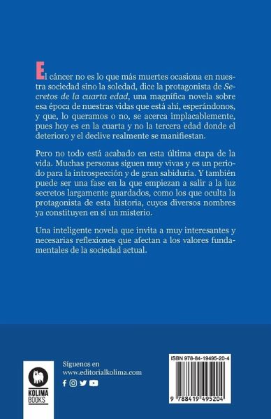 El cáncer no es lo que más muertes ocasiona en nuestra sociedad sino la soledad, dice la protagonista de Secre-tos de la cuarta edad, una novela sobre esa época de nuestras vidas que está ahí, esperándonos, y que, lo que-ramos o no, se acerca implacablemente, pues hoy es la cuarta y no la tercera edad la etapa en la que el deterioro y el declive realmente se manifiestan. Pero no todo está acabado en esta fase. Las personas siguen vivas y es un periodo para la introspección y de gran sabiduría. Y también una etapa en la que empiezan a salir a la luz secretos largamente guardados...