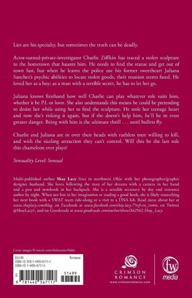 Lies are his specialty, but sometimes the truth can be deadly. Actor turned private investigator Charlie Ziffkin has traced a stolen sculpture to the hometown that haunts him. He needs to find the statue and get out of town fast, but when he learns the police use his former sweetheart Juliana Sanchez's psychic abilities to locate stolen goods, their reunion seems fated. He loved her as a boy; as a man with a terrible secret, he has to let her go. Juliana knows firsthand how well Charlie plays whatever role suits him, whether P.I. or lover, so he could be pretending to desire her while using her to find the sculpture. He stole her teenage heart and now she's risking it again, but if she doesn't help him, he'll be in even greater danger. Being with him is the ultimate thrill . . . until bullets fly. Charlie and Juliana are in over their heads with ruthless men willing to kill, and with the sizzling attraction they can't control. Will this be the last role this chameleon ever plays? Sensuality Level: Sensual