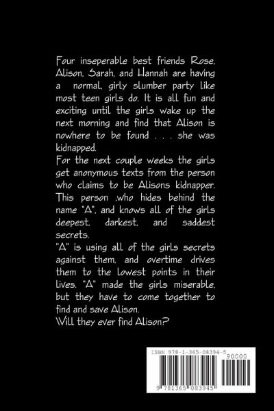 Four inseparable best friends Rose, Alison, Sarah, and Hannah are having a normal, girly slumber party like most teens girls do. It is all fun and exciting until the girls wake up the next morning and find that Alison is nowhere to be found . . . she was kidnapped. For the next couple weeks the girls get anonymous texts from the person who claims to be Alison's kidnapper. This person, who hides behind the name "A", knows all of the girls deepest, darkest, and saddest secrets. "A" is using all of the girls secrets against them and overtime drives them to the lowest points in their lives. "A" made the girls miserable, but they have to come together to find and save Alison. Will they ever find Alison?