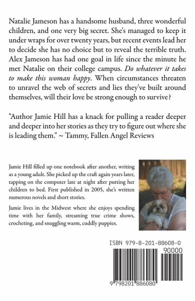Natalie Jameson has a handsome husband, three wonderful children, and one very big secret. She's managed to keep it under wraps for over twenty years, but recent events lead her to decide she has no choice but to reveal the terrible truth. Alex Jameson has had one goal in life since the minute he met Natalie on their college campus. Do whatever it takes to make this woman happy. When circumstances threaten to unravel the web of secrets and lies they've built around themselves, will their love be strong enough to survive? "Author Jamie Hill has a knack for pulling a reader deeper and deeper into her stories as they try to figure out where she is leading them." ~ Tammy, Fallen Angel Reviews