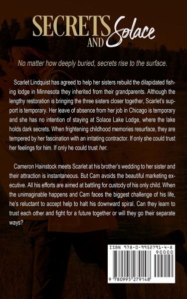 No matter how deeply buried, secrets rise to the surface. Scarlett Lindquist has agreed to help her sisters rebuild the dilapidated fishing lodge in Minnesota they inherited from their grandparents. Although the lengthy restoration is bringing the three sisters closer together, Scarlett's support is temporary. Her leave of absence from her job in Chicago is temporary and she has no intention of staying at Solace Lake Lodge, where the lake holds dark secrets. When frightening childhood memories resurface, they are tempered by her fascination with an irritating contractor. If only she could trust her feelings for him. If only he could trust her. Cameron Hainstock meets Scarlett at his brother's wedding to her sister and their attraction is instantaneous. But Cam avoids the beautiful marketing executive. All his efforts are aimed at battling for custody of his only child. When the unimaginable happens and Cam faces the biggest challenge of his life, he's reluctant to accept help to halt his downward spiral. Can they learn to trust each other and fight for a future together or will they go their separate ways?