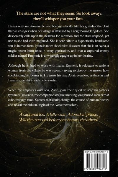 The stars are not what they seem. So look away; they'll whisper you your fate. Iyana's only ambition in life is to become a healer like her grandmother, but that all changes when her village is attacked by a neighboring kingdom. She desperately calls upon the heavens for salvation and the stars respond, yet not as she had ever imagined. She is sent Altair, a hypnotically handsome star in human form. Iyana is more shocked to discover that she is an Aztia, a magic bearer born once in every generation, and that a captured enemy soldier named Emmeric is unwittingly caught up in her destiny. Although he is fated to work with Iyana, Emmeric is reluctant to assist a woman from the village he was recently trying to destroy, no matter how spellbinding her beauty is. He trusts his rival Altair even less, as the star and Iyana are caught in each other's orbit. When the emperor's own son, Zane, joins their quest to stop his father's tyrannical invasion, the companions begin unveiling long-buried secrets that echo through time. Secrets that could change the course of human history and reveal the hidden origin of the Aztia themselves. A captured foe. A fallen star. A forsaken prince. Betrayal is inevitable. But who will perpetrate it?