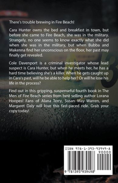 There's trouble brewing in Fire Beach! Cara Hunter owns the bed and breakfast in town, but before she came to Fire Beach, she was in the military. Strangely, no one seems to know exactly what she did when she was in the military, but when Bubba and Makenna find her unconscious on the floor, her past may finally get revealed. Cole Davenport is a criminal investigator whose lead suspect is Cara Hunter, but when he meets her, he has a hard time believing she's a killer. When he gets caught up in Cara's past, will he be able to help her? Or will he lose his life in the process? Find out in this gripping, suspenseful fourth book in The Men of Fire Beach series from best selling author Lorana Hoopes! Fans of Alana Terry, Susan May Warren, and Margaret Daly will love this fast-paced ride. Grab your copy today!