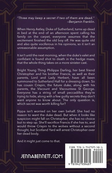 England, late April, 1926 When Henry Astley, Duke of Sutherland, turns up dead in bed at the end of an afternoon spent calling his family on the carpet, everyone assumes that the excitement finished the old boy off. He was quite old and also quite vociferous in his opinions, so it isn't an unreasonable assumption. It isn't until the next morning, when the duke's valet and confidant is found shot to death in the hedge maze, that the whole thing takes on a more sinister cast. Bright Young Thing Philippa Darling, her best friend Christopher and his brother Francis, as well as their parents, Lord and Lady Herbert, have all been summoned to Sutherland Hall for a dressing down. So has cousin Crispin, the future duke, along with his parents, the Viscount and Viscountess St George. Everyone has a string of small peccadillos they're trying to hide, along with a few guilty secrets they don't want anyone to know about. The only question is, which secret was worth killing for? Pippa isn't worried on her own behalf. She had no reason to want the duke dead. But when it looks like suspicion might fall on Christopher, she has no choice but to step up. She'll sacrifice Francis if she has to, and would throw Crispin to the wolves without a second thought, but Scotland Yard will arrest Christopher over her dead body. And it might just come to that.