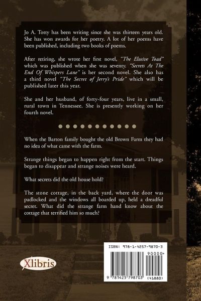 When the Barton family bought the old Brown farm, weird things began to happen and at night, strange noises could be heard. In the backyard, there was a small cottage where the door was padlocked - and the windows boarded up. What did the strange farmhand know about the cottage that terrified him so much? What secrets did the old house hold?