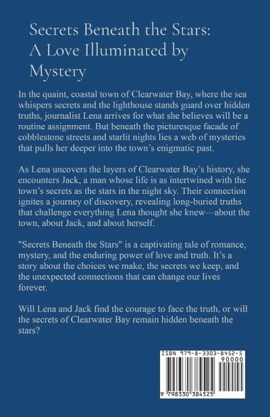 Book Description: In the small, coastal town of Clearwater Bay, where the ocean meets the sky under a blanket of stars, mystery lingers in the air, and secrets are hidden beneath the waves. For generations, this town has kept its secrets well, but when investigative journalist Lena arrives, those long-buried truths begin to surface. Lena expects Clearwater Bay to be just another assignment-a picturesque place with a history to uncover. But from the moment she steps onto the weathered cobblestone streets, she feels the pull of something deeper, something that whispers of past lives and unresolved stories. The town's lighthouse stands as a sentinel against the rugged coastline, its light cutting through the darkness, much like Lena's quest for the truth. Here, she meets Jack, a man whose past is as enigmatic as the town itself, and together they are drawn into a web of intrigue that challenges everything Lena thought she knew. As Lena delves into the town's past, she discovers that the truth is far more complex and dangerous than she imagined. The lines between love and betrayal, past and present, blur as Lena and Jack unravel the mysteries that have haunted Clearwater Bay for decades. In a place where every corner holds a secret and every star in the sky seems to hold a story, Lena must confront not only the town's history but also the truths she's hidden from herself. "Secrets Beneath the Stars" is a captivating tale of love, mystery, and the unyielding search for truth. With its richly drawn characters and atmospheric setting, this novel invites readers to journey into a world where the past is never truly gone, and where every revelation brings both risk and redemption. Enter Clearwater Bay, where the stars are waiting to share their secrets, and discover a story that will stay with you long after the final page is turned.