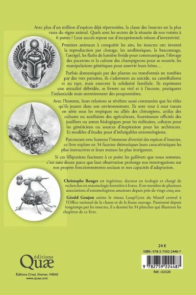 Avec plus d'un million d'espèces déjà répertoriées, la classe des Insectes est la plus vaste du règne animal. Quels sont les secrets de la réussite de nos voisins à 6 pattes ? Leur succès repose sur d'exceptionnels trésors d'inventivité. Premiers animaux à conquérir les airs par le vol, les insectes ont inventé la reproduction par clonage, les antibiotiques, le braconnage, l'antigel, les flashs codés de lumière froide pour communiquer, l'élevage des pucerons et la culture des champignons pour se nourrir, les manipulations génétiques pour asservir leurs hôtes... Parfois domestiqués par des plantes ou transformés en zombies par des vers parasites, ils s'adonnent au suicide, au cannibalisme et au rapt, mais exercent la solidarité familiale. Ils expriment une sexualité débridée, se livrent au viol et à l'inceste, pratiquent l'infanticide mais entretiennent des pouponnières. Avec l'homme, leurs relations se révèlent aussi contrastées que les rôles qu'ils jouent dans son environnement. Ils sont tour à tour tueurs en série sous les tropiques ou alliés des chirurgiens, Attila des cultures ou auxiliaires des agriculteurs, fournisseurs officiels des joailliers ou armes biologiques pour les militaires, cobayes pour les généticiens ou sources d'inspiration pour les architectes. Et modèles d'études pour d'infatigables entomologistes. Parcourant, souvent avec humour, l'immense diversité des espèces d'insectes, ce livre explore en 34 facettes thématiques les caractéristiques les plus instructives et les moeurs les plus intrigantes de ces animaux. Si ces Lilliputiens fascinent à ce point les Gullivers que nous sommes, c'est sans doute parce que leur observation prolonge nos interrogations sur nos propres fonctionnements sociaux et nos capacités d'adaptation.