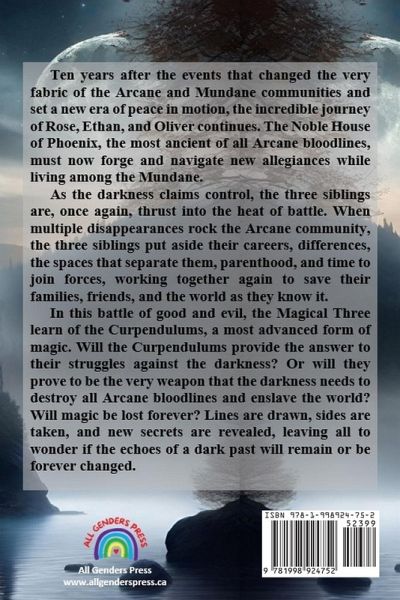 Ten years after the events that changed the very fabric of the Arcane and Mundane communities and set a new era of peace in motion, the incredible journey of Rose, Ethan, and Oliver continues. The Noble House of Phoenix, the most ancient of all Arcane bloodlines, must now forge and navigate new allegiances while living among the Mundane. As the darkness claims control, the three siblings are, once again, thrust into the heat of battle. When multiple disappearances rock the Arcane community, the three siblings put aside their careers, differences, the spaces that separate them, parenthood, and time to join forces, working together again to save their families, friends, and the world as they know it. In this battle of good and evil, the Magical Three learn of the Curpendulums, a most advanced form of magic. Will the Curpendulums provide the answer to their struggles against the darkness? Or will they prove to be the very weapon that the darkness needs to destroy all Arcane bloodlines and enslave the world? Will magic be lost forever? Lines are drawn, sides are taken, and new secrets are revealed, leaving all to wonder if the echoes of a dark past will remain or be forever changed.
