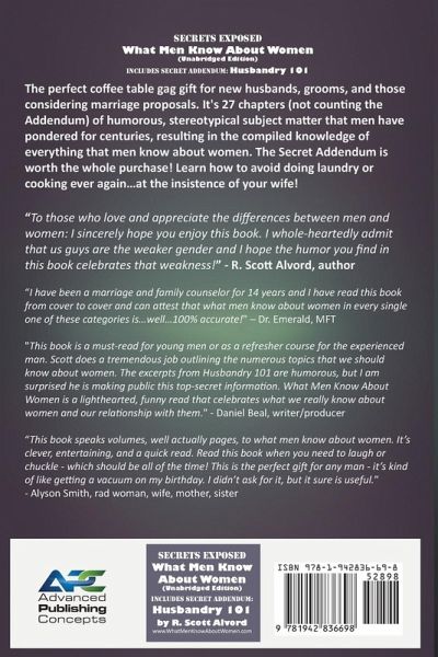 The perfect coffee table gag gift for new husbands, grooms, and those considering marriage proposals. It's 27 chapters (not counting the Addendum) of humorous, stereotypical subject matter that men have pondered for centuries, resulting in the compiled knowledge of everything that men know about women. The Secret Addendum is worth the whole purchase! Learn how to avoid doing laundry or cooking ever again...at the insistence of your wife! "To those who love and appreciate the differences between men and women: I sincerely hope you enjoy this book. I whole-heartedly admit that us guys are the weaker gender and I hope the humor you find in this book celebrates that weakness!" - R. Scott Alvord, author "I have been a marriage and family counselor for 14 years and I have read this book from cover to cover and can attest that what men know about women in every single one of these categories is...well...100% accurate!" - Dr. Emerald, MFT "This book is a must-read for young men or as a refresher course for the experienced man. Scott does a tremendous job outlining the numerous topics that we should know about women. The excerpts from Husbandry 101 are humorous, but I am surprised he is making public this top-secret information. What Men Know About Women is a lighthearted, funny read that celebrates what we really know about women and our relationship with them." - Daniel Beal, writer/producer "This book speaks volumes, well actually pages, to what men know about women. It's clever, entertaining, and a quick read. Read this book when you need to laugh or chuckle - which should be all of the time! This is the perfect gift for any man - it's kind of like getting a vacuum on my birthday. I didn't ask for it, but it sure is useful." Alyson Smith - rad woman, wife, mother, sister.