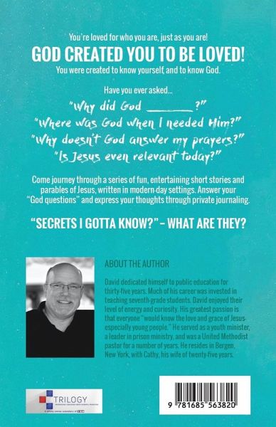 You're loved for who you are, just as you are! GOD CREATED YOU TO BE LOVED! You were created to know yourself and to know God. Have you ever asked... "Why did God _?" "Where was God when I needed Him?" "Why doesn't God answer my prayers?" "Is Jesus even relevant today?" Come journey through a series of fun, entertaining short stories and parables of Jesus, written in modern-day settings. Answer your "God questions" and express your thoughts through private journaling. "SECRETS I GOTTA KNOW?" - WHAT ARE THEY?