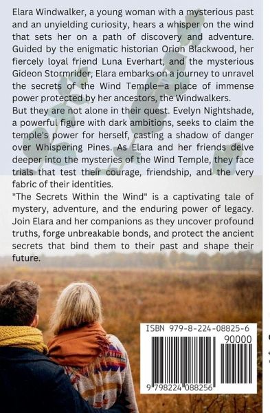 In the secluded town of Whispering Pines, nestled among mist-covered mountains and ancient forests, the wind carries more than just the rustling of leaves-it holds secrets of an ancient legacy, waiting to be uncovered. Elara Windwalker, a young woman with a mysterious past and an unyielding curiosity, hears a whisper on the wind that sets her on a path of discovery and adventure. Guided by the enigmatic historian Orion Blackwood, her fiercely loyal friend Luna Everhart, and the mysterious Gideon Stormrider, Elara embarks on a journey to unravel the secrets of the Wind Temple-a place of immense power protected by her ancestors, the Windwalkers. But they are not alone in their quest. Evelyn Nightshade, a powerful figure with dark ambitions, seeks to claim the temple's power for herself, casting a shadow of danger over Whispering Pines. As Elara and her friends delve deeper into the mysteries of the Wind Temple, they face trials that test their courage, friendship, and the very fabric of their identities. "The Secrets Within the Wind" is a captivating tale of mystery, adventure, and the enduring power of legacy. Join Elara and her companions as they uncover profound truths, forge unbreakable bonds, and protect the ancient secrets that bind them to their past and shape their future. Dive into this enchanting story where every whisper of the wind reveals a new secret, every challenge uncovers a new truth, and every step brings the legacy of the Windwalkers closer to destiny.