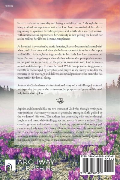 Suzette is about to turn fifty and facing a mid-life crisis. Although she has always valued her reputation and what God has commanded of her, she is beginning to question her life's purpose and worth. As a married woman with limited sexual experiences, her curiosity is now getting the best of her as she realizes her life has become complacent. As her mind is overtaken by erotic fantasies, Suzette becomes infatuated with what could have been and what she believes she needs in order to be happy and fulfilled. Although she is grounded in her faith, lust has taken over her heart. But everything changes when she has a dream that prompts her to turn to her past for answers and, in the process, reconnects with God as secrets unfold and doors open to reveal her soul. While on a peace-seeking journey, Suzette is encouraged by scripture and prayer as she slowly rekindles the romance in her marriage and delivers a renewed passion to the man who has been perfect for her all along. Secrets in the Garden shares the inspirational story of a middle-aged woman's introspective journey as she rediscovers her purpose and peace in life, with help from a loving God.