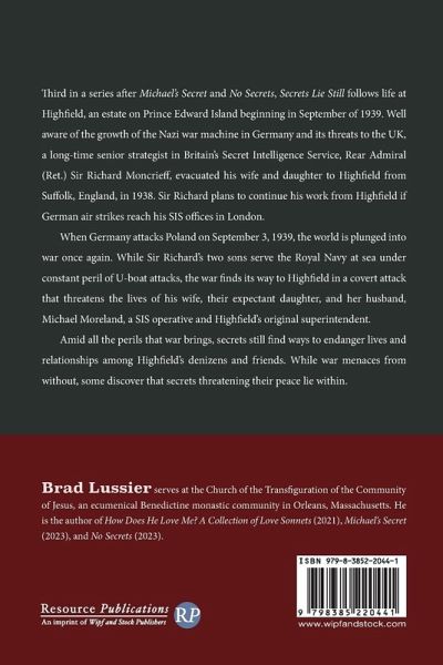Third in a series after Michael's Secret and No Secrets, Secrets Lie Still follows life at Highfield, an estate on Prince Edward Island beginning in September of 1939. Well aware of the growth of the Nazi war machine in Germany and its threats to the UK, a long-time senior strategist in Britain's Secret Intelligence Service, Rear Admiral (Ret.) Sir Richard Moncrieff, evacuated his wife and daughter to Highfield from Suffolk, England, in 1938. Sir Richard plans to continue his work from Highfield if German air strikes reach his SIS offices in London. When Germany attacks Poland on September 3, 1939, the world is plunged into war once again. While Sir Richard's two sons serve the Royal Navy at sea under constant peril of U-boat attacks, the war finds its way to Highfield in a covert attack that threatens the lives of his wife, their expectant daughter, and her husband, Michael Moreland, a SIS operative and Highfield's original superintendent. Amid all the perils that war brings, secrets still find ways to endanger lives and relationships among Highfield's denizens and friends. While war menaces from without, some discover that secrets threatening their peace lie within.