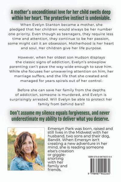 A mother's unconditional love for her child swells deep within her heart. The protective instinct is undeniable.When Evelyn Stanton became a mother, she pledged that her children would always be her number one priority.Even though as teenagers, they require less time and attention, they continue to be her passion, some might call it an obsession.Motherhood is her heart and soul. Her children give her life purpose. However, when her oldest son Hudson displays the classic signs of addiction, Evelyn's snowplow parenting can't pavethe way wide enough to save him. While she focuses her unwavering attention on him, her marriage suffers,and the life that she created and managed for years spirals out of her control. Before she can save her family from the depths of addiction, someone is murdered, and Evelyn is arrested.Will Evelyn be able to protect her family from behind bars? Don't assume my silence equals forgiveness, and never underestimate my ability to deliver what you deserve.