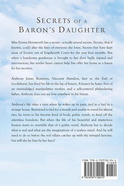 Miss Emma Hensworth has a secret- actually several secrets. Secrets, that if known, could alter the fates of everyone she loves. Secrets that have kept most of Society out of Engalworth Court for the past four months. But when a handsome gentleman is brought to her door badly injured and unconscious, her tender heart cannot help but offer her home as a haven for his recovery. Anthony James Kempton, Viscount Hamdon, heir to the Earl of Licolnhurst, has lived his life in the lap of luxury. A luxury he hates. Son of an overindulged manipulative mother, and a self-centered philandering father, Anthony does not see love anywhere in his future. His life takes a turn when he wakes up in pain, tied to a bed in a strange house. Now, restricted to bed for a month and unable to travel for almost two, he turns to his favorite kind of book, gothic novels, to fend off the relentless boredom. But when the life of his beautiful and mysterious hostess starts to resemble that of a gothic novel, Anthony has to decide what is real and what are the imaginations of a restless mind. And he will need to do so before the evil villain catches up with the intrepid heroine, but will she let him be her hero?