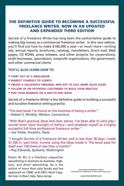 The definitive guide to becoming a successful freelance writer, now in an updated and expanded third edition Secrets of a Freelance Writer has long been the authoritative guide to making big money as a commercial freelance writer. In this new edition, you'll find out how to make $100,000 a year-or much more-writing ads, annual reports, brochures, catalogs, newsletters, direct mail, Web pages, CD-ROMs, press releases, and other projects for corporations, small businesses, associations, nonprofit organizations, the government, and other commercial clients. You'll also learn how to start out as a freelancer, market yourself to clients, create a successful personal Web site to cull more sales leads, follow up on potential customers to build your practice, and run your business on a day-to-day basis. Secrets of a Freelance Writer is the definitive guide to building a successful and lucrative freelance writing practice.