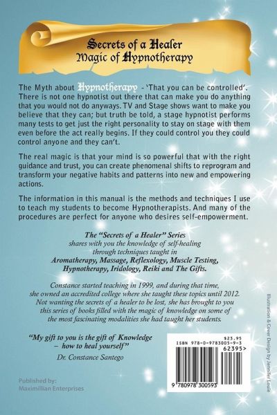 "The Miracle of Hypnotherapy: Unlocking the Power of the Subconscious Mind" Have you ever been fascinated by the mysterious world of hypnosis? In "Secrets of a Healer - Magic of Hypnotherapy," author Dr. Constance Santego takes you on a captivating journey into the realm of hypnosis and reveals the incredible power it holds to transform lives. From a young age, the author was intrigued by the mesmerizing effects of hypnosis, witnessing renowned hypnotists like Reveen as they effortlessly induced a trance state and influenced people's behaviors. However, it wasn't until later in life that the author delved deeper into the secrets behind this captivating practice, eager to understand how it could help individuals overcome their limitations. In this book, you will explore the inner workings of hypnosis, discovering how it functions as a form of meditation and a direct gateway to the subconscious mind. Through the author's extensive experience as a hypnotherapist, you will gain valuable insights into the immense potential of hypnotherapy to alleviate phobias, release past traumas, conquer fears, and break free from self-sabotaging patterns. But that's not all. "Secrets of a Healer - Magic of Hypnotherapy" goes beyond hypnotherapy alone. The author combines this powerful technique with various other modalities to create a holistic approach to healing and self-empowerment. By studying this book and mastering the concepts and techniques presented, you will acquire the skills to perform basic hypnotherapy sessions. You will learn to help others reduce stress, relax tense muscles, and unlock the untapped potential of their body, mind, and soul. Key Learning Outcomes:Relax, Rejuvenate, and Expand your Awareness: Discover how hypnotherapy can help you achieve deep relaxation, heightened awareness, and a profound sense of rejuvenation. Learn the many Different Types of Inductions and Techniques: Explore a wide range of induction methods and techniques used in hypnotherapy, allowing you to tailor your approach to individual needs and preferences. Bonus - Learn the 'Energy Clearing Technique': Uncover an additional tool in your healing arsenal as you learn the Energy Clearing Technique, a valuable method to clear negative energy and restore balance. "Secrets of a Healer - Magic of Hypnotherapy" is a comprehensive guide that equips you with the knowledge and skills to transform lives through the power of hypnotherapy. Whether you aspire to become a professional hypnotherapist or simply want to help your friends and family on their journey to self-discovery and empowerment, this book is your gateway to unlocking the miraculous potential of the subconscious mind.