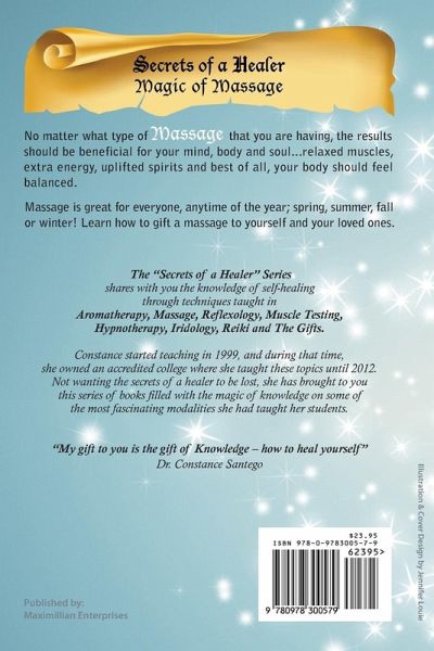 Secrets of a Healer - Magic of Massage includes over twelve massages and the specific movements and techniques that I taught my students when I owned an accredited Natural Health & Healing College. Have fun practicing these beneficial massages on your friends and family. LEARNING OUTCOME: When you have completed this book and studied the concepts and techniques, you will be able to perform many massages that help to reduce stress, relax sore and achy muscles, and improve many of the body’s vital systems; such as circulation and lymphatic. Relax, Rejuvenate, and Bond Many Different Types of Massages Be Able to perform Basic Massage Techniques on yourself, friends, and loved ones.