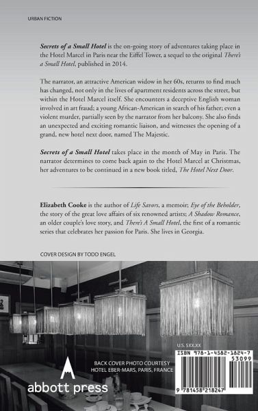 Secrets of a Small Hotel is the on-going story of adventures taking place in the Hotel Marcel in Paris near the Eiffel Tower, a sequel to the original There's a Small Hotel, published in 2014. The narrator, an attractive American widow in her 60s, returns to find much has changed, not only in the lives of apartment residents across the street, but within the Hotel Marcel itself. She encounters a deceptive English woman involved in art fraud; a young African-American in search of his father; even a violent murder, partially seen by the narrator from her balcony. She also finds an unexpected and exciting romantic liaison, and witnesses the opening of a grand, new hotel next door, named The Majestic. Secrets of a Small Hotel takes place in the month of May in Paris. The narrator determines to come back again to the Hotel Marcel at Christmas, her adventures to be continued in a new book titled, The Hotel Next Door.
