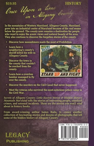 Once upon a time in Allegany County... In the mountains of Western Maryland, Allegany County, Maryland, grew into an industrial center of Maryland because of the coal seams below the ground. The county now remains a destination for people who want to enjoy the scenic views and natural beauty of the area. They also continue to discover the forgotten stories of the county.Discover how moonshiners made the most of Prohibition. Learn how a neighboring's county's sheriff killed his wife in Allegany County. Discover the town in the county that couldn't be reached from the county. Learn how a crewless bomber managed to fly over the county. Discover the murders on the C&O Canal that never happened. Meet the veteran who survived the most-notorious prison camp in the Civil War. Secrets of Allegany County: Little-Known Stories & Hidden History Mountain Maryland tells the stories of interesting people, unsolved crimes, and unusual incidents. These are the stories you won't read about in history books. From award-winning author James Rada, Jr. comes another collection of fascinating stories and dozens of photographs that tell some of the hidden history of Allegany County.