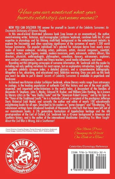 Who is your favorite celebrity? Have you ever wondered what their surname means or where it originated? Now you can discover the answer for yourself in Secrets of the Celebrity Surnames: An Onomastic Dictionary of Famous People. In this one-of-a-kind illustrated reference book (one known as an onomasticon), the author, award-winning writer, historian, and lexicographer Lochlainn Seabrook, combines both his 45 year expertise in etymology and his lifelong multi-field background in the entertainment industry to explore the fascinating and often surprising significance of the surnames of nearly 1,300 world famous luminaries. The popular individuals he's selected for inclusion derive from nearly every realm of human endeavor, including actors, politicians, artists, classical composers, scientists, inventors, writers, sports figures, models, modern musicians, poets, astronauts, military officers, film directors, physicists, anthropologists, philosophers, comedians, dancers, astronomers, explorers, news anchors, entrepreneurs, health and fitness teachers, social media influencers, and more. Rounding out this intriguing cornucopia of surname information, Mr. Seabrook aids the reader by including not only spelling variations for most names, but an explanatory introduction, helpful notes, a complete celebrity surname index, a detailed glossary, and a comprehensive bibliography. Altogether a fun, absorbing, and educational read. Addiction warning: Once you pick up this book you won't be able to put it down! Secrets of Celebrity Surnames is available in paperback and hardcover. (All text copyright © Sea Raven Press) Award-winning historian Lochlainn Seabrook is currently the author and editor of nearly 100 books, including: Abraham Lincoln Was a Liberal, Jefferson Davis Was a Conservative; Lincoln's War: The Real Cause, the Real Winner, the Real Loser; The Unholy Crusade: Lincoln's Legacy of Destruction in the American South; Heroes of the Southern Confederacy: The Illustrated Book of Confederate Officials, Soldiers, and Civilians; What the Confederate Flag Means to Me; The Great Yankee Coverup: What the North Doesn't Want You to Know About Lincoln's War; Confederacy 101: Amazing Facts You Never Knew About America's Oldest Political Tradition; Confederate Flag Facts: What Every American Should Know About Dixie's Southern Cross; Support Your Local Confederate: Wit and Humor in the Southern Confederacy; Women in Gray: A Tribute to the Ladies Who Supported the Southern Confederacy; The Concise Book of Owls; The Concise Book of Tigers; Victorian Hernia Cures; North America's Amazing Mammals; Jesus and the Law of of Attraction; Jesus and the Gospel of Q; Christ is All and in All; Everything You Were Taught About American Slavery is Wrong, Ask a Southerner!; Honest Jeff and Dishonest Abe: A Southern Children's Guide to the Civil War; The Bittersweet Bond: Race Relations in the Old South as Described by White and Black Southerners; The Constitution of the Confederate States of America Explained; A Rebel Born: A Defense of Nathan Bedford Forrest; Christmas Before Christianity; All We Ask is to be Let Alone: The Southern Secession Fact Book; The Rise and Fall of the Confederate Government (reprint editor).