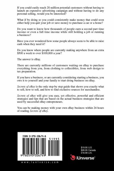 If you could easily reach 20 million potential customers without having to launch an expensive advertising campaign and without having to do any personal selling, would you be interested? What if by doing so you could consistently make money that could soon either help you quit your job or save money to purchase a car or a home? Do you want to know how thousands of people earn a second part time income or even a full time income while still holding a job or running a business? Have you ever wondered how some people always seem to be able to raise cash when they need it? Do you know where people are currently making anywhere from an extra $500 a week to over $100,000 a year? The answer is eBay. There are currently millions of customers waiting on eBay to purchase everything from you, from clothing to collectibles, from web design to tax preparation. If you have a business, or are currently considering starting a business, you owe it to yourself and your family to start doing business on eBay. Secrets of eBay is the only step by step guide that shows you exactly what to sell, how to sell, and how to find exclusive sources for merchandise. Secrets of eBay will give you easy, yet effective, powerful and efficient strategies and tips that are based on the actual business strategies that are used by successful eBay entrepreneurs. You can be making money with your own eBay business within 24 hours of reading Secrets of eBay.