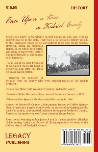 Once upon a time in Frederick County... Frederick County is Maryland's largest county in size, and with its central location in the state, it has seen a lot of state's history unfold. It still maintains much of its agricultural roots and scenic beauty. However, along its mountain slopes, in the street of its cities, and along its waterways, history has unfolded and, in some cases, been forgotten.Read about the first President of the United States. He lived in Frederick, and after his death his grave was forgotten. Discover the pioneers of aviation from the county who were contemporaries of the Wright Brothers. Learn how Babe Ruth was discovered in Frederick County. March with the Marines as they invaded Frederick County in 1922. Discover how Spanish Flu devastated the county in 1918. Secrets of Frederick County: Little-Known Stories & Hidden History About Maryland's Largest County tells the stories of interesting people, unsolved crimes, and unusual incidents throughout Frederick County. These are the stories you won't read about in history books. From award-winning author James Rada, Jr. comes another collection of fascinating stories and dozens of photographs that tell some of the hidden history of Frederick County.