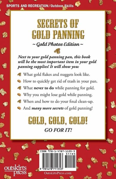 Secrets of Gold Panning ~ Gold Photos Edition ~...Next to your gold panning pan, this book will be the most important item in your gold panning supplies! It will show you: What gold flakes and nuggets look like. How to quickly get rid of trash in your pan. What never to do while panning for gold. Why you might lose gold while panning. When and how to do your final clean-up. And many more secrets of gold panning! GOLD, GOLD, GOLD! GO FOR IT!