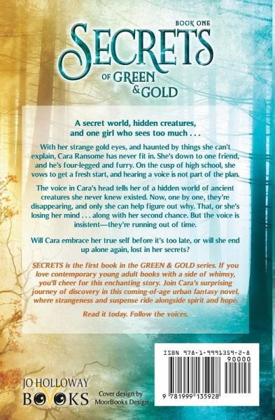 An immortal race needs her help ... if she believes they exist. Cara thought she had finally learned to ignore the animals no one else sees. A new school in the fall is her dream come true ... Somewhere to start over, somewhere no one knows her. She should have known it was doomed the minute she heard the first voice. Now there's a weird gleam in her dog's eye, two suspicious guys who keep turning up, and a voice in her head. While it tells her of a hidden race of immortal beings known as the Pyx, Cara does her best to ignore it and the others who join in. Fitting in is hard enough without the local fauna chatting in her head. But the voices are insistent. Across Portland, Pyx are disappearing, and Cara is the only one who can help them. As bizarre encounters pile up, Cara begins to wonder if the only way to stop the voices, is to start listening. The only problem is, if the Pyx are real, then so is the danger. So how exactly is Cara supposed to save them? SECRETS is the first book in the GREEN & GOLD series, perfect for fans of modern young adult fantasy, hidden worlds, and unexpected friendships, filled with whimsy and mystery. Join Cara's surprising journey of discovery in this coming-of-age fantasy novel, where strangeness and suspense ride alongside spirit and hope.