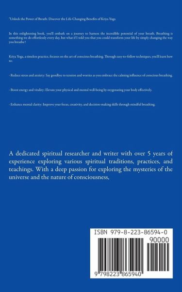 "Unlock the Power of Breath: Discover the Life-Changing Benefits of Kriya Yoga In this enlightening book, you'll embark on a journey to harness the incredible potential of your breath. Breathing is something we do effortlessly every day, but what if I told you that you could transform your life by simply changing the way you breathe? Kriya Yoga, a timeless practice, focuses on the art of conscious breathing. Through easy-to-follow techniques, you'll learn how to: - Reduce stress and anxiety: Say goodbye to tension and worries as you embrace the calming influence of conscious breathing. - Boost energy and vitality: Elevate your physical and mental well-being by oxygenating your body effectively. - Enhance mental clarity: Improve your focus, creativity, and decision-making skills through mindful breathing. - Cultivate inner peace: Experience profound serenity as you connect with the rhythm of your breath. - Explore your spiritual potential: Dive into the depths of self-discovery and spirituality through the sacred art of Kriya Yoga. This book is your gateway to a life filled with health, tranquility, and self-realization. It's time to embark on a journey within, one breath at a time. Are you ready to transform your life through the power of breath?"