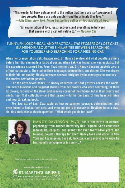 You've seen them. Hanging on telephone poles and posted on supermarket bulletin boards. But have you ever wondered about the stories behind them? When her orange tabby, Zak, disappeared, Nancy Davidson did what countless people before her had done. She made a lost cat poster. And after days of frantic searching, she found him. Nancy was ecstatic. Zak seemed happy, too-although being a cat, it was hard to tell. Zak may have remained his old self, but Nancy had changed. From that moment on, she became acutely aware of lost cat posters. She studied their language, composition, and design. She was drawn to their folk art. Mostly, however, she was intrigued by the messages themselves-the stories behind the posters. It wasn't long before Nancy reached out to other owners of lost and found cats to offer empathy and support. They told hilarious and often poignant stories. They sought advice. That's when Dr. Nancy, the cat lover and the seasoned therapist, stepped in and offered insights brought to light by her shrewd, but never self-serious analysis. What they told her-and what she learns - creates a captivating look into the heart of our relationships with our pets and each other. For seven years, Dr. Nancy followed the lost cat trail discovering answers to a question that eventually touches all of us: What will you do for love? The Secrets of Lost Cats traces the evolution of Nancy Davidson's seven-year passion for lost cat posters. From the astonishing, almost implausible posters she encounters across the country-and indeed, the world-to the daring, dedication, and emotional complexity of the cat owners themselves, The Secrets of Lost Cats offers readers an absorbing journey that illuminates love, loss, and learning to love again, even more deeply.