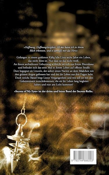 »Hoffnung, Hoffnungslosigkeit. All das kann ich in ihrem Blick erkennen, und es zerreißt mir das Herz«Gefangen in einem goldenen Käfig lebt Lizzy sechs Jahre ein Leben, das nicht ihres ist. Nur dass sie das nicht weiß.An ihrem sechzehnten Geburtstag schleicht sie sich aus ihrem Elternhaus und befindet sich das erste Mal in ihrem Leben auf offener Straße. Dort begegnet sie Lincoln, der sofort einen Narren an dem Mädchen mit den grünen Augen gefressen hat und der ihr Leben aus den Fugen hebt. Doch welche Rätsel birgt Lizzys Vergangenheit und wie soll sie mit den Geheimnissen zurechtkommen, die sie ihr Leben lang begleitet haben und nun ans Licht kommen?»Secrets of My Eyes« ist der dritte und letzte Band der Secrets-Reihe.