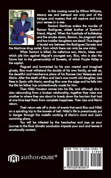 In this rousing novel by Wilma Williams, steamy sex and betrayal are only part of the intrigue and mystery that will capture and hold your senses in a vise. Santoni Martinas orders the murder of Ramon Rodrigues, oldest brother of Santoni's friend, Miguel. When the fussilade of bullets stop and the smoke clears, Ramon, his pregnant wife and two toddler daughters are dead! Thus begins a feudal war between the Rodrigues Dynasty and the Martinas drug cartel, from which there can only be one victor. When Santoni is killed, his nefarious son, Mario, takes over which pits him against Miguel's youngest son, Rico, who is also the future heir to the governorship of Sonesta, of which Purple Valley is the capitol. Plagued and tormented by his own mental and imagined ghosts, Rico must withstand the doubts of his own family, as well as, the deceitful and treacherous plans of his fiancee Lisa Velesquez and Mario. After the death of Rico and Lisa's one month old daughter, Lisa flees to Spain with Mario, sending Rico over the edge and he falls into the life his father has unintentionally made for him. Then Nikki Houston comes into his life, and although she is also rebounding from a broken relationship, together they raise one another to where they are about to break down the barriers that had at one time kept them from complete happiness. Then Lisa and Mario return. Their return sets off a chain of events that send Rico and Nikki on a spiraling trip to the bowels of hell. Nikki's life is precariously put in danger through the malefic working of Mario's mind and Lisa's conniving plans. You will be infected by the heartaches and joys as your journey to the final climatic conclusion impacts your soul and leaves it emotionally content.