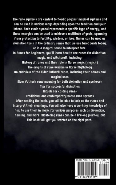 The rune symbols are central to Nordic pagans' magical systems and can be used in various ways depending upon the tradition and your intent. Each runic symbol represents a specific type of energy, and these energies can be used to achieve a multitude of goals, spanning from protection to fertility, wisdom, or love. Runes can be used as divination tools in the ordinary sense that we use tarot cards today, or in a magical sense to interpret fate. In Runes for Beginners, you'll learn how to use runes for divination, magic, and witchcraft, including: History of runes and their role in Norse magic The origins of rune wisdom in Norse Mythology An overview of the Elder Futhark runes, including their names and magical uses Elder Futhark rune meaning for both divination and spellwork Tips for successful divination Rituals for casting runes Traditional and contemporary norse rune spreads After reading the book, you will be able to look at the runes and interpret their meanings. You will also have a working knowledge of how to use them in magic for various purposes such as divination, healing, and more. Mastering runes can be a lifelong journey, but this book will get you started on the right path.