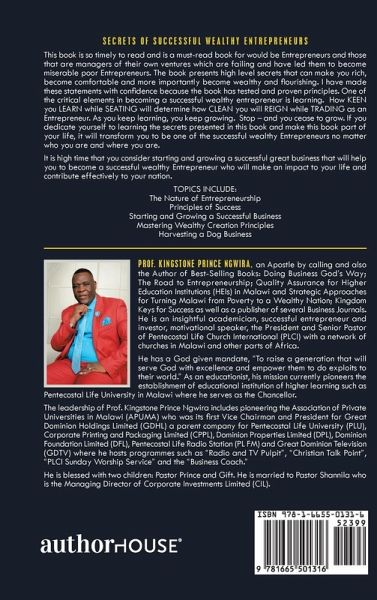 SECRETS OF SUCCESSFUL WEALTHY ENTREPRENEURS This book is so timely to read and is a must-read book for would be Entrepreneurs and those that are managers of their own ventures which are failing and have led them to become miserable poor Entrepreneurs. The book presents high level secrets that can make you rich, become comfortable and more importantly become wealthy and flourishing. I have made these statements with confidence because the book has tested and proven principles. One of the critical elements in becoming a successful wealthy entrepreneur is learning. How KEEN you LEARN while SEATING will determine how CLEAN you will REIGN while TRADING as an Entrepreneur. As you keep learning, you keep growing. Stop - and you cease to grow. If you dedicate yourself to learning the secrets presented in this book and make this book part of your life, it will transform you to be one of the successful wealthy Entrepreneurs no matter who you are and where you are. It is high time that you consider starting and growing a successful great business that will help you to become a successful wealthy Entrepreneur who will make an impact to your life and contribute effectively to your nation. TOPICS INCLUDE: The Nature of Entrepreneurship Principles of Success Starting and Growing a Successful Business Mastering Wealthy Creation Principles Harvesting a Dog Business