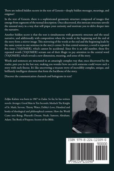 There are indeed hidden secrets in the text of Genesis-deeply hidden messages, meanings, and enigmas! In the text of Genesis, there is a sophisticated geometric structure composed of images that emerge from segments of the textual description. Once discovered, this intricate structure unveils the unusual story in a way that will pique your curiosity and motivate you to delve deeper into the narrative. Another hidden secret is that the text is simultaneous with geometric structure and the usual narrative, and additionally with composition when the words at the beginning and the end of the story form a mirror image. This mirroring of the words at the end and the beginning leads by the same system to one sentence in the story's center. In that central sentence, a word is repeated five times (VAJOMER), which cannot be accidental. Since five is an odd number, those five repeated words (VAJOMER) scream out of their illogic to pay attention to the central word (VAJOMER), which reveals a new dimension, meaning, and sense of the story. Words and sentences are structured in an amazingly complex way that, once discovered by the reader, puts you in the hot seat, making you wonder how on earth someone could weave such a story with such finesse. It's like uncovering a treasure trove of incredibly complex, unique, and brilliantly intelligent elements that form the backbone of the story. Discover the communication channels and holograms in text!