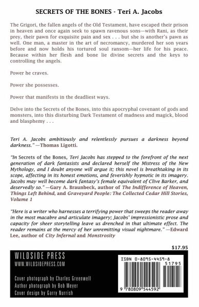 The Grigori, the fallen angels of the Old Testament, have escaped their prison in heaven and once again seek to spawn ravenous sons-with Rani, as their prey, their pawn for exquisite pain and sex . . . but she is another's pawn as well. One man, a master in the art of necromancy, murdered her son years before and now holds his tortured soul ransom-her life for his peace. Because within her flesh and bone lie divine secrets and the keys to controlling the angels. Power he craves. Power she possesses. Power that manifests in the deadliest ways. Delve into the Secrets of the Bones, into this apocryphal covenant of gods and monsters, into this disturbing Dark Testament of madness and magick, blood and blasphemy...
