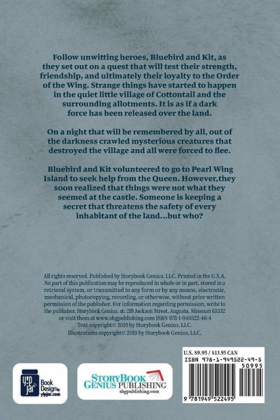 Paperback Edition with 82 Black and White Illustrated Pages Bluebird and Kit are on a quest that tests their strength, friendship and ultimately their loyalty to the Order of the Wing. Strange things are happening in the quiet little village of Cottontail, as if a dark force has been released over the land. This graphic novel has adventure, lore and mystery and is similar in style to The Lord of the Rings. On a night that will be remembered by all, out of the darkness crawled mysterious creatures that destroyed the village and all were forced to flee. Bluebird and Kit volunteer to go to Pearl Wing Island to seek help from the Queen. However, they soon realize that things are not what they seem at the castle. Someone is keeping a secret that threatens the safety of every inhabitant of the land...but who?