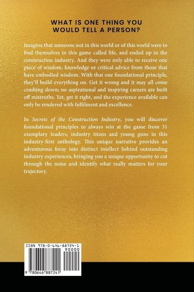 WHAT IS ONE THING YOU WOULD TELL A PERSON? Imagine that someone not in this world or of this world were to find themselves in this game called life, and ended up in the construction industry. And they were only able to receive one piece of wisdom, knowledge or critical advice from those that have embodied wisdom. With that one foundational principle, they'll build everything on. Get it wrong and it may all come crashing down; no aspirational and inspiring careers are built off mistruths. Yet, get it right, and the experience available can only be rendered with fulfilment and excellence. In Secrets of the Construction Industry, you will discover foundational principles to always win at the game from 31 exemplary leaders, industry titans and young guns in this industry-first anthology. This unique narrative provides an adventurous foray into distinct intellect behind outstanding industry experiences, bringing you a unique opportunity to cut through the noise and identify what really matters for your trajectory.