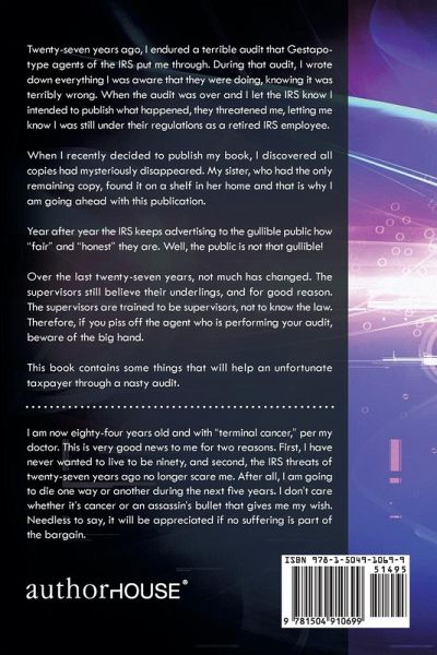 Twenty-seven years ago, I endured a terrible audit that Gestapo-type agents of the IRS put me through. During that audit, I wrote down everything I was aware that they were doing, knowing it was terribly wrong. When the audit was over and I let the IRS know I intended to publish what happened, they threatened me, letting me know I was still under their regulations as a retired IRS employee. When I recently decided to publish my book, I discovered all copies had mysteriously disappeared. My sister, who had the only remaining copy, found it on a shelf in her home and that is why I am going ahead with this publication. Year after year the IRS keeps advertising to the gullible public how "fair" and "honest" they are. Well, the public is not that gullible! Over the last twenty-seven years, not much has changed. The supervisors still believe their underlings, and for good reason. The supervisors are trained to be supervisors, not to know the law. Therefore, if you piss off the agent who is performing your audit, beware of the big hand. This book contains some things that will help an unfortunate taxpayer through a nasty audit.