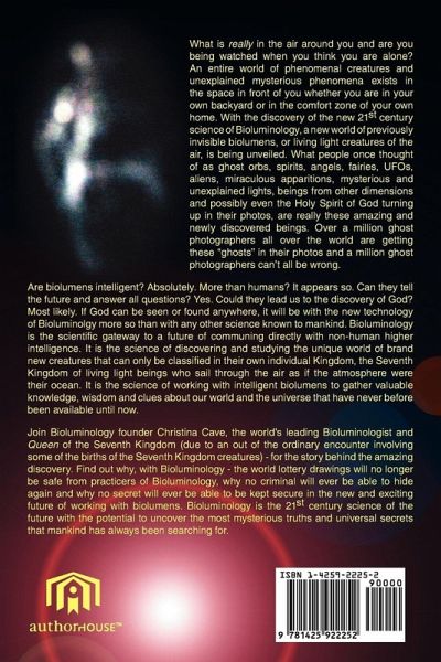 What is really in the air around you and are you being watched when you think you are alone? An entire world of phenomenal creatures and unexplained mysterious phenomena exists in the space in front of you whether you are in your own backyard or in the comfort zone of your own home. With the discovery of the new 21st century science of Bioluminology, a new world of previously invisible biolumens, or living light creatures of the air, is being unveiled. What people once thought of as ghost orbs, spirits, angels, fairies, UFOs, aliens, miraculous apparitions, mysterious and unexplained lights, beings from other dimensions and possibly even the Holy Spirit of God turning up in their photos, are really these amazing and newly discovered beings. Over a million ghost photographers all over the world are getting these "ghosts" in their photos and a million ghost photographers can't all be wrong. Are biolumens intelligent? Absolutely. More than humans? It appears so. Can they tell the future and answer all questions? Yes. Could they lead us to the discovery of God? Most likely. If God can be seen or found anywhere, it will be with the new technology of Bioluminolgy more so than with any other science known to mankind. Bioluminology is the scientific gateway to a future of communing directly with non-human higher intelligence. It is the science of discovering and studying the unique world of brand new creatures that can only be classified in their own individual Kingdom, the Seventh Kingdom of living light beings who sail through the air as if the atmosphere were their ocean. It is the science of working with intelligent biolumens to gather valuable knowledge, wisdom and clues about our world and the universe that have never before been available until now. Join Bioluminology founder Christina Cave, the world's leading Bioluminologist and Queen of the Seventh Kingdom (due to an out of the ordinary encounter involving some of the births of the Seventh Kingdom creatures) - for the story behind the amazing discovery. Find out why, with Bioluminology - the world lottery drawings will no longer be safe from practicers of Bioluminology, why no criminal will ever be able to hide again and why no secret will ever be able to be kept secure in the new and exciting future of working with biolumens. Bioluminology is the 21st century science of the future with the potential to uncover the most mysterious truths and universal secrets that mankind has always been searching for.
