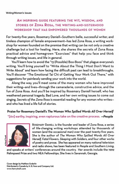 An inspiring guide featuring the wit, wisdom, and stories of Zona Rosa, the writing-and-sisterhood workshop that has empowered thousands of women For more than twenty years, Rosemary Daniell-Southern belle, successful writer, and tireless champion of female empowerment-has led Zona Rosa, a writing workshop for women founded on the premise that writing can be not only a creative challenge but a tool for healing. Here, she shares the secrets of Zona Rosa: practical advice and home-grown "Exorcises" that help you face and think through writing issues, and life in general. You'll learn how to avoid the "13 (Possible) Boo Boos" that plague everyone's writing. You'll bring yourself to "Write About the Thing I Most Don't Want to Write About" and learn how facing the difficult past can lead to breakthroughs. You'll discover "The Emotional Tai Chi of Getting Your Work Out There," with suggestions for painlessly sending your work into the world. Along the way, you'll meet some of the many women who have improved their writing-and lives-through the camaraderie, constructive advice, and fun of Zona Rosa. And you'll be inspired by Rosemary Daniell herself, who has weathered personal tragedy, Bad Love, and her own writing issues to come out singing. Secrets of the Zona Rosa is essential reading for any woman who writes-and who has lived a life full of stories.