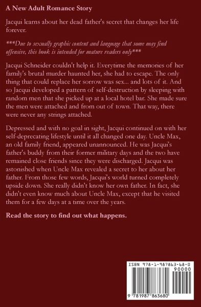 A New Adult Romance Story Jacqui learns about her dead father's secret that changes her life forever. ***Due to sexually graphic content and language that some may find offensive, this book is intended for mature readers only*** Jacqui Schneider couldn't help it. Everytime the memories of her family's brutal murder haunted her, she had to escape. The only thing that could replace her sorrow was sex... and lots of it. And so Jacqui developed a pattern of self-destruction by sleeping with random men that she picked up at a local hotel bar. She made sure the men were attached and from out of town. That way, there were never any strings attached. Depressed and with no goal in sight, Jacqui continued on with her self-deprecating lifestyle until it all changed one day. Uncle Max, an old family friend, appeared unannounced. He was Jacqui's father's buddy from their former military days and the two have remained close friends since they were discharged. Jacqui was astonished when Uncle Max revealed a secret to her about her father. From those few words, Jacqui's world turned completely upside down. She really didn't know her own father. In fact, she didn't even know much about Uncle Max, except that he visited them for a few days at a time over the years. Read the story to find out what happens.